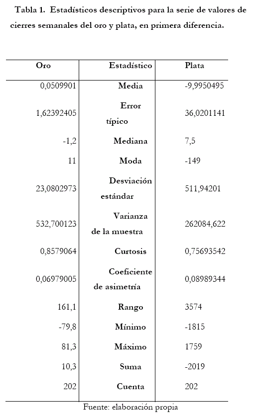 En la Tabla 1 se presentan el análisis de ambas series de valores de cierre en primera diferencia, del oro y de la plata. Ambos commodities arrojaron un coeficiente de asimetría positivo, esto quiere decir que es una distribución asimétrica donde existe mayor concentración de valores a la derecha de la media que a su izquierda. Es importante mencionar lo entregado por la curtosis, los cuales son positivos, esto significa que la distribución de los valores observados en ambos commodities adoptaron una forma leptokurtósica, esto quiere decir que la distribución toma una forma más picuda.