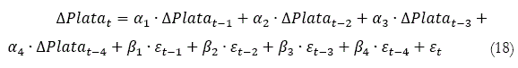 En la ecuación (17) y (18) se muestran para el caso del oro y de la plata el mejor modelo multivariado dinámico para cada caso estudiado con el Porcentaje de predicción de Signo.