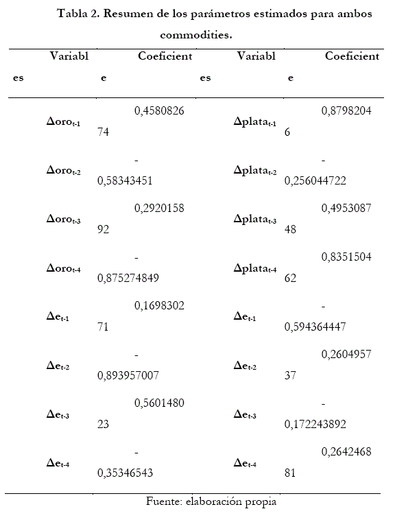 Los coeficientes αi y βi del mejor modelo para el caso del oro y la plata se muestran en la tabla 2, estos en términos del porcentaje de predicción de signo que se obtienen por el modelo, los cuales maximizan el PPS, estos coeficientes se obtuvieron después de desarrollar el modelo utilizando fuerza bruta operacional, alcanzando un millón de iteraciones.