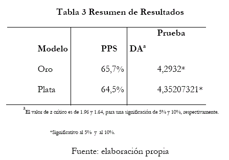 En la Tabla 3 se muestran los porcentajes de predicción de signo arrojados para ambos casos, para el oro y la plata, que se obtuvieron desde los mejores modelos producidos por ARIMA con fuerza bruta. La capacidad predictiva fue estimada en un conjunto extramuestral de 203 datos semanales para ambos casos, y según el resultado que entregó la prueba de acierto direccional se concluye que esta capacidad predictiva es estadísticamente significativa en cada uno de sus valores, comprobándose con esto la hipótesis de que si existe capacidad predictiva del modelo optimizado con fuerza bruta operacional aplicados al oro y la plata.
