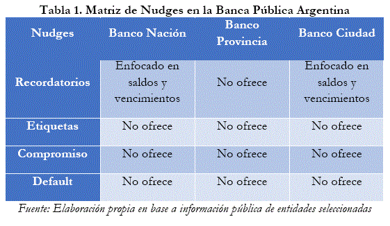 Consiguientemente, en la tercera sección, se estudiará el contexto en Argentina, se analizará el estado de aplicación en la banca pública y se identificarán las únicas dos fintech argentinas que han utilizado nudges con el objetivo de fomentar el ahorro de manera similar a como se hizo en experimentos de campo en otras partes del mundo. Se comparará el producto ofrecido por las mismas con los de la banca, y se harán recomendaciones de política pública tendientes a poner en práctica estas intervenciones a través de instituciones de banca pública, con el objetivo de focalizar los nudges en segmentos particularmente vulnerables de la población, analizando brevemente los potenciales beneficios tanto para usuarios como para las instituciones que decidan tomar el curso de acción aquí recomendado.