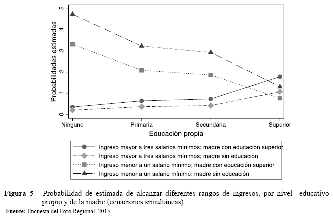 A la luz de la Figura 5 y las brechas entre las curvas correspondientes a la probabilidad de alcanzar un determinado nivel de ingresos, resalta el hecho que bajos niveles educativos de la madre afecten en mayor medida la probabilidad de alcanzar niveles salariales desfavorables (i.e. menos de un salario mínimo), en términos absolutos, en comparación al efecto que tiene sobre las probabilidadesde alcanzar niveles salariales favorables (i.e. más de un salario mínimo).