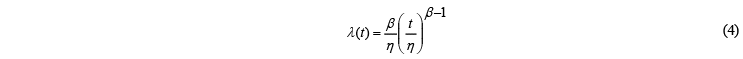 La distribución de Weibull [3] es una de las herramientas más utilizadas en mantenimiento para estimaciones de probabilidad de falla, en este caso, es usada en relación a las fallas aparecidas en equipos de alta criticidad. Tiene la ventaja de ser muy flexible y adaptable a una variedad de observaciones experimentales, su función general es: