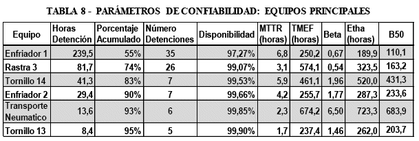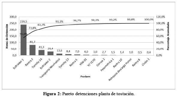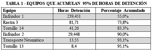 Del análisis de Pareto se puede observar que seis equipos concentran alrededor del 95 % de las detenciones del complejo de Tostación. Los equipos que acumulan el 95 % de las horas de detención se listan en la Tabla 1.