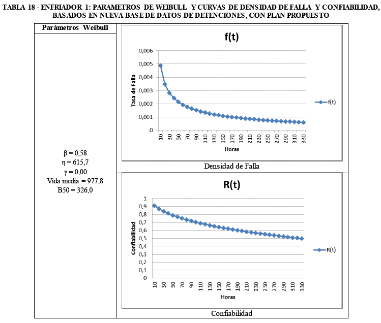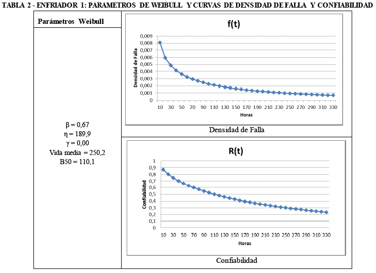 De los gráficos de densidad de falla y confiabilidad en la Tabla 2, se deduce que para el Enfriador 1 la densidad de fallas tiene una forma decreciente, esto también se ve en el factor β = 0,67, que indica que la tasa de falla es decreciente, lo cual implica que el equipo está en una fase de fallas prematuras.