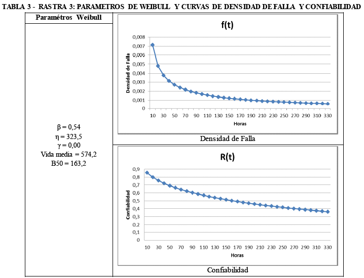 De los gráficos de la Tabla 3, se deduce que para la rastra 3 la densidad de fallas tiene una forma decreciente, esto también se ve en el factor β = 0,54, el cual indica que la tasa de falla es decreciente, esto implica que el equipo está en una fase de fallas prematuras. El tiempo medio entre fallas es de 574,2 horas, sin embargo, para alcanzar este valor existe solo un 25,7 % de probabilidad. El factor esta es de 323,5 horas, esto quiere decir, que sobre este número de horas se concentra el 63,2% de las fallas. La probabilidad de falla de un 50% está en las 110 horas, esto se denota por el valor de B50.