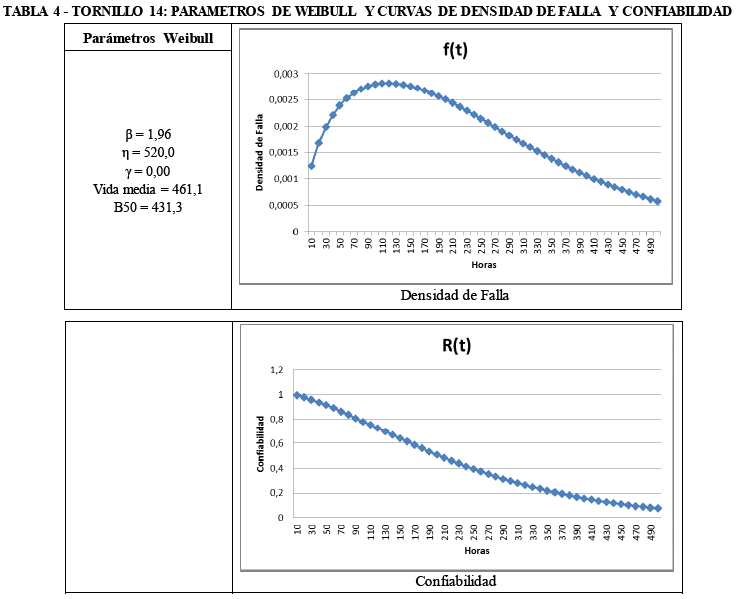 De los gráficos de la Tabla 4, se deduce que para el Tornillo 14 la densidad de fallas tiene una forma de campana, esto también se ve en el factor β = 1,96 el cual, al ser mayor que 1, indica que la tasa de falla es creciente, y por tanto, el equipo está en una fase de fallas por vejez.