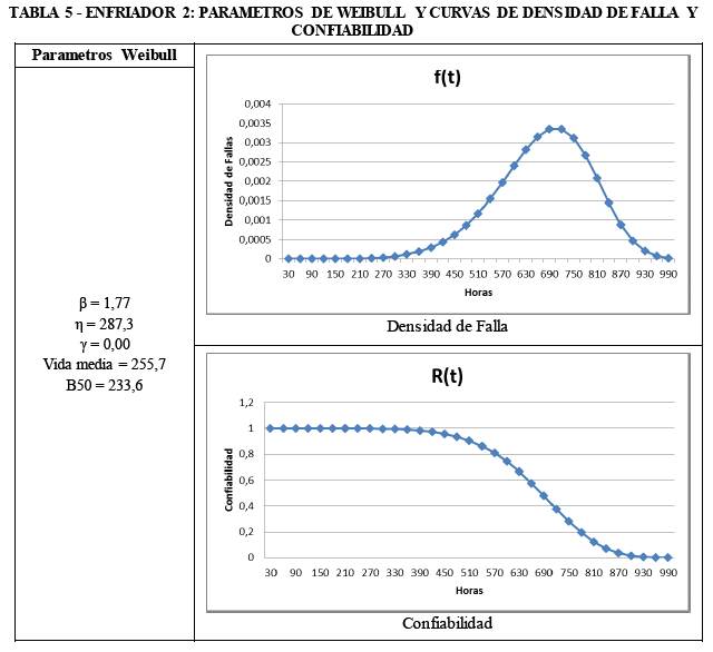 De los gráficos de la Tabla 5, se deduce que para el Enfriador 2 la densidad de fallas tiene una forma de campana, esto también se ve en el factor β = 1,77, el cual indica que la tasa de falla es creciente, y por tanto el equipo está en una etapa de fallas por vejez: