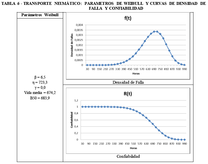 De los gráficos de la Tabla 6, se deduce que para el Transporte Neumático, la densidad de fallas tiene una forma de campana, esto también se ve en el factor β = 6,5 el cual, al ser mayor que 1, indica que la tasa de falla es creciente, y por tanto el equipo está en una fase de fallas por vejez.