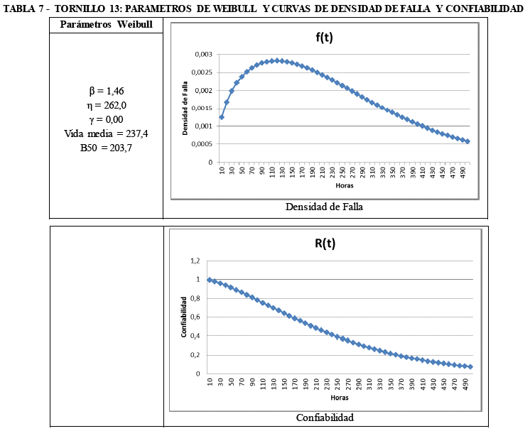 De los gráficos de la Tabla 7, se deduce que para el Tornillo 13 la densidad de fallas tiene una forma de campana, dado que β = 1,46, indica que la tasa de falla es creciente, por tanto el equipo está en una fase de fallas por vejez.