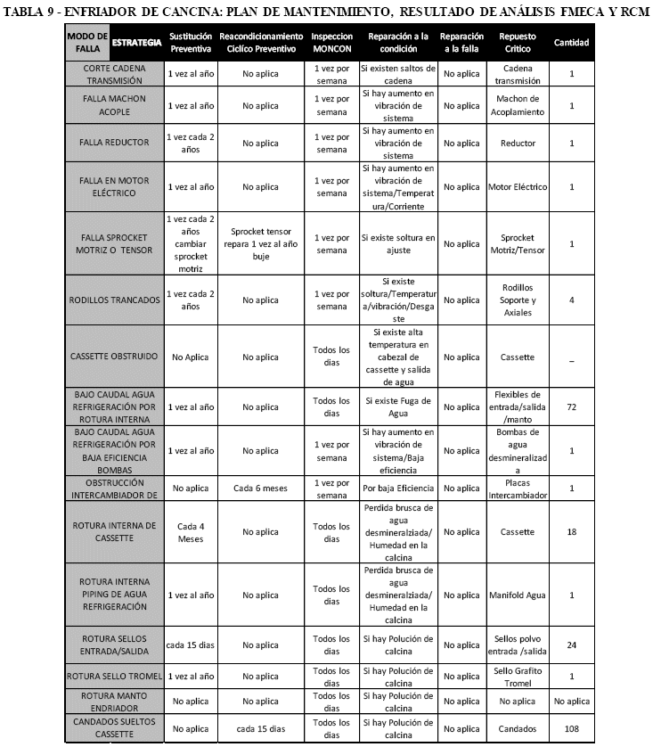 Para optimizar el plan de mantenimiento se realiza el análisis FMECA, una metodología ampliamente utilizada para reconocer la naturaleza de las fallas, las necesidades del mantenimiento y las áreas de mejoras potenciales. Del análisis FMECA, se concluye que todos los modos de fallas son críticos, y a través del árbol de decisión de la metodología RCM se obtienen las actividades de mantenimiento y listado de repuestos críticos para un enfriador, según se muestra en Tabla 9.