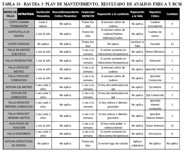 Actualmente la rastra 3 posee una estrategia de mantenimiento basada en la inspección de componentes críticos. Dentro de las inspecciones se encuentra la medición de vibraciones de elementos rodantes como descansos y motor eléctrico. También se realiza una ruta de lubricación la cual consiste en lubricadores automáticos para los descansos, cadena de transmisión y reductor. Dentro de plan de mantenimiento también existe la inspección visual y el monitoreo de comportamiento de corriente. Más allá de los puntos anteriores, cuando existen componentes críticos en falla que impiden la operación de la rastra, se realiza detención no programada para solucionar la falla y seguir operando. Los componentes críticos de mayor tasa de falla son la cadena motriz, pasadores y rastra. Los componentes señalados anteriormente en la mayoría de los casos se han cambiado cuando estos fallan.