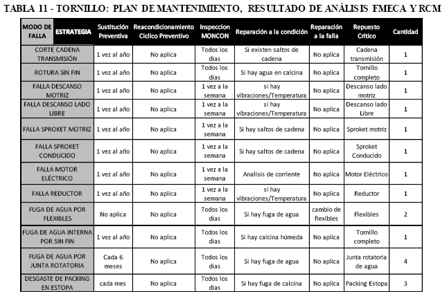 Después de realizar el análisis FMECA, se desprenden para el tornillo, las actividades de mantenimiento listadas en la Tabla 11.