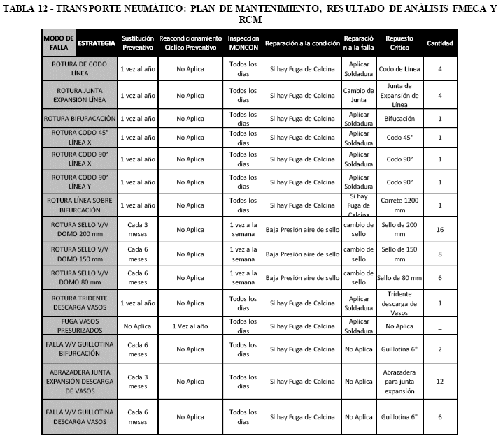 Actualmente el transporte neumático posee una estrategia de mantenimiento basada en la inspección de componentes críticos. Dentro de las inspecciones se encuentra inspección visual por fugas en línea. Existe una línea única de transporte, solo se cambia un componente cuando esté esta en falla o detiene la línea. Los componentes críticos de mayor tasa de falla son rotura de línea, sellos de válvulas domo. Los componentes señalados anteriormente en la mayoría de los casos se cambian cuando fallan.