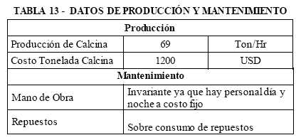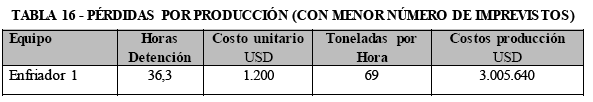 De los análisis y metodología utilizada en secciones anteriores, se realiza el análisis de sensibilidad para estimar el aumento en la confiabilidad de los activos principales, así como también, la estimación en la posible reducción de costos utilizando la nueva propuesta de mantenimiento. Considerando los datos acerca de producción y mantenimiento (según Tabla 13) se calcula la pérdida ocasionada por detenciones imprevistas, tomando en particular el caso del Enfriador 1.