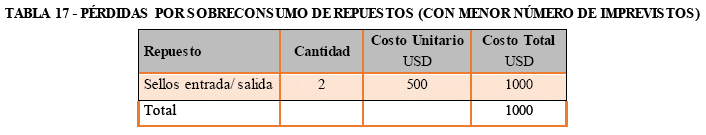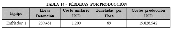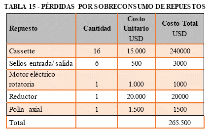 Para el análisis se calculan las pérdidas reales, causadas tanto por pérdidas de producción, como por sobrecostos en repuestos y mano de obra, obteniendo un total de pérdidas por 20.092.042 dólares, según se detalla en Tablas 14 y 15, respectivamente.
