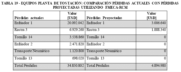Utilizando esta metodología y análisis a los demás equipos principales de la planta de tostación, y comparando las pérdidas actuales con las perdidas proyectadas, se muestran los resultados en la Tabla 19.