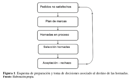 La planificación de las entregas de la producción terminada se realiza por pedidos, lo que presupone la producción de acuerdo a la llegada misma de cada pedido, o por inventarios, lo que implica producir para acumular inventarios y entregar de acuerdo a la disponibilidad del pedido. Una combinación de ambos es la opción indicada para minimizar costos totales [11]- [13]. Para generar las opciones de destino de las hornadas producidas se elabora un plan de marcas por parte del sistema de dirección de la producción de las empresas, teniendo en cuenta la carpeta de pedidos de los clientes (ver Figura 1). El subsistema de dirección de la producción encargado de la determinación del destino de las hornadas selecciona cuales hornadas van a satisfacer determinados pedidos y cuales han de permanecer almacenadas en espera de su destino definitivo.