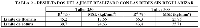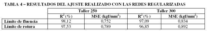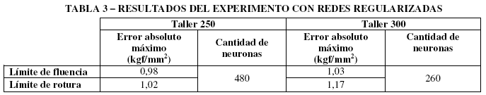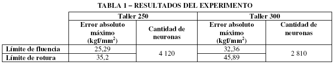 Utilizando las funciones antes descritas se fue evaluando (para cada taller y para cada propiedad) el error absoluto máximo entre las propiedades mecánicas calculadas y las medidas, para diferentes cantidades de neuronas de base radial. La Tabla 3 muestra la cantidad de neuronas de base radial en el experimento para el cual se obtuvo el menor error absoluto máximo para cada propiedad, y en cada taller.