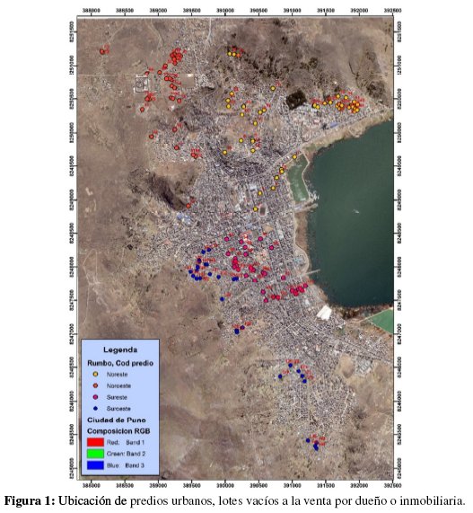 Se organizaron 4 cuadrillas de 11 integrantes, los cuales registraron en fichas datos de ubicación geográfica en coordenadas UTM WGS 84 zona 19 L [29], el área de venta, el costo en moneda nacional (S/.), croquis y registro fotográfico del predio, el tiempo de registro de la información se dio en 4 meses desde enero a abril del 2019. Para procesar los datos espaciales se utilizaron imágenes satélites con resolución de 21z [30], como se muestra en la Figura 1, además se consideró la totalidad del área urbana consolidada de la ciudad de Puno, El análisis se hizo en el software Arcgis, Sas planet y Google Earth [31]. La tabulación de datos y análisis estadísticos se usó los programas Microsoft office – Excel y SPSS v.22, para facilitar el tratamiento del conjunto de datos.