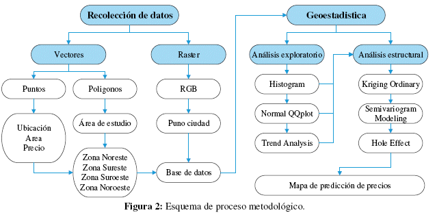 Los datos espaciales se ubicaron en el espacio en un raster de 21z de resolución para luego analizarlos a través de la geoestadística, los resultados del registro se modelarán para ver el comportamiento planimétrico del precio predial urbano en formato raster de cálculo compatible [32], se georreferenciará los puntos de muestreo en un sistema de información geográfica para la construcción y digitalización de una base de datos gráfica para sobre poner los resultados de la investigación en una imagen satelital de la ciudad de Puno. La comparación de método de interpolación a través de la geoestadístico se establece 2 pasos, análisis exploratorio; de datos donde se obtuvo un histograma, la gráfica Q-Q Plot de datos teóricos y reales, la ubicación espacial de muestras a través del análisis de tendencia para la obtención del orden de las ecuaciones y generar un mapa de voronoi. Análisis estructural de datos; donde se obtuvo un mapa predictivo con las siguientes condicionantes, se analizaron los 11 modelos de semivariograma predeterminados en el Arcgis donde se descartó la presencia de anisotropías en los modelos, además se comparó la acumulación los errores en el dataset de los valores del root mean square, mean standardized, root mean square standardized y average standard error. El mapa predictivo y de error estándar nos mostró el nivel de confiabilidad y coherencia grafica del mapa resultante [33]. Este proceso se muestra en la Figura 2.