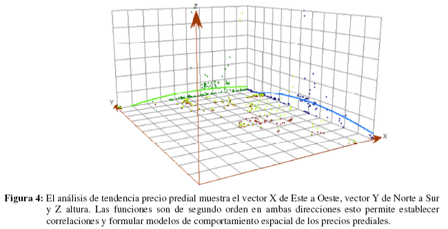 El análisis de tendencia (ecuación de la recta) que se muestra en la Figura 4, donde se observó que la tendencia de los precios prediales, de norte a sur (línea azul) y de este a oeste (línea verde), forma una curva graficada en una ecuación de segundo grado para el análisis estructural.