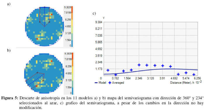 Al desarrollar el análisis estructural de datos para el análisis del método geoestadístico considerando el Kriging/coKriging de tipo ordinary con una superficie resultante tipo predicción para el dataset se usó en todos los casos transformación logarítmica con una tendencia de datos de segundo orden, usándose 11 modelos de predicción en los cuales se descartó la presencia de anisotropía como se muestra en la Figura 5.
