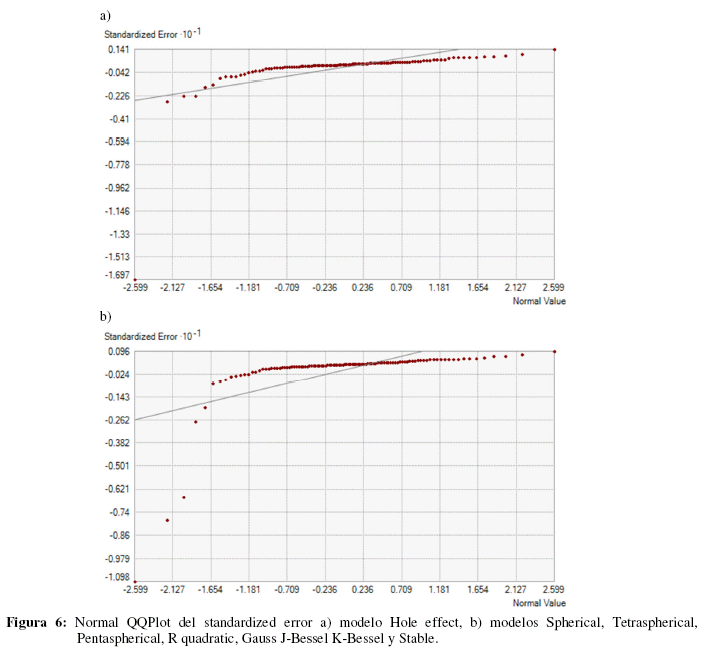 Las ecuaciones de las funciones resultantes de las regresiones de los 11 modelos matemáticos del semivariograma para el dataset, además la sumatoria de errores muestran que el mejor modelo es el Hole effect con una acumulación de error de 239001,75 unidades del coeficiente de determinación, garantizando que las pruebas estadísticas muestran las ecuaciones funcionales y correctas con intervalos de confianza mayores al 95%, así mismo el gráfico Normal QQPlot del error estandarizado muestra un comportamiento normal a diferencia de los demás modelos que muestran un dispersión clara de -2.599 al -1.654 en la recta normal y de -1.098 al - 0.143 de la recta del standardized error como se muestra en la Figura 6, los cuales son indicadores para elegir un modelo de mapeo con mayor exactitud, el resultado de modelo Hole effect en la predicción del precio predial se muestra en la Figura 7.