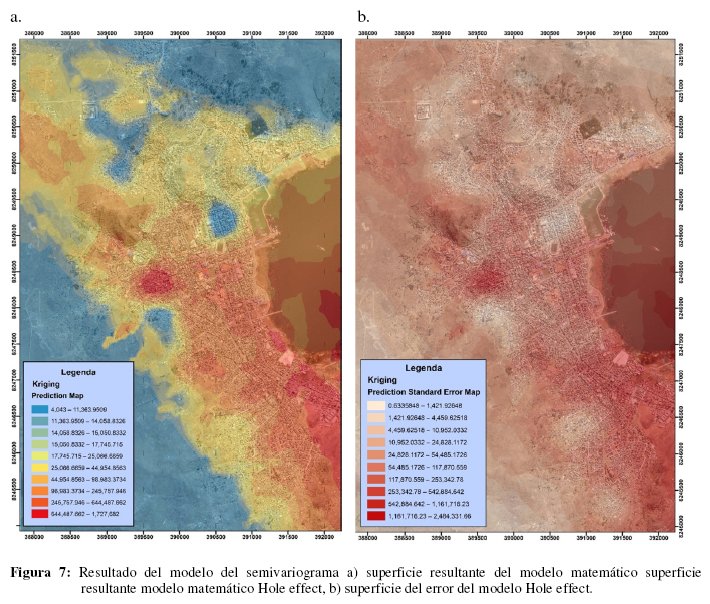 Los resultados muestran el índice de confianza, el coeficiente de determinación y la coherencia gráfica se muestra en la Figura 7, siendo el modelo Hole effect el que muestran un error de modelo de 2.48% para la superficie de respuesta y su gráfica es coherente con la ubicación de la nube de puntos que es lo esperado para el modelado. Seguir con una metodología general para superar restricciones geoestadísticas de homogeneidad en monitoreo y análisis espacial mostro que los modelos matemáticos del semivariograma reducen eficientemente la probabilidad de error [34], además se infiere que nuestro modelo de predicción tiene una confiabilidad de 97.52%, además se puede apreciar que los costos inmobiliarios más altos se encuentran entre los 620017.00 hasta 1727682.00 nuevos soles por un promedio de 160 m2, constando así el metro cuadrado de terreno entre 3875.00 a 10798.00 nuevo soles, estas zonas se encuentran ubicados al Noreste y Sureste de nuestro estudio exactamente en la rivera de la bahía interior del lago Titicaca en la zona antigua de la ciudad de Puno la que cuenta con todos los servicios públicos, accesibilidad y variedad de equipamiento urbano. La zona periurbana ubicada al Noroeste y Suroeste de nuestro estudio en la cadena montañosa del Azoguine, Ventilla y Cancharían con una topografía agreste considera la zona periurbana de la ciudad de Puno experimenta un fenómeno totalmente distinto ya que los precios se encuentran entre los 6000.00 a 12130.00 nuevos soles esto debido a que no cuentas con servicios básicos, accesibilidad ni equipamiento urbano. Por tal motivo las personas adquieren lotes en esta zona por su condición económica y la necesidad de vivienda, generando problemas administrativos en las entidades gubernamentales y sobretodo en la calidad de vida de los nuevos pobladores, la dinámica del mercado inmobiliario en la ciudad es causada por la demanda y la oferta no regulada debido al exceso de ahorro de los trabajadores de la minería informal por el auge del oro.