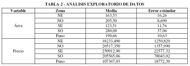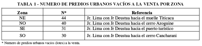 La investigación fue realizada en la ciudad de Puno capital de la región del mismo nombre en el Sur del Perú que se encuentra ubicada entre las coordenadas 15°50′15″ Latitud Sur y 70°01′18″ Longitud Oeste a una altura de 3819 msnm. En general el clima de Puno es frío y seco sin embargo al ubicarse a orillas del lago Titicaca el clima es templado por su influencia. Las precipitaciones pluviales duran 5 meses de diciembre a abril [28], siendo atractivo estas condiciones climáticas para el mercado inmobiliario regional. Para realizar el estudio la ciudad de Puno se dividió por rumbos en cuatro sectores como se muestra en la Tabla 1, siendo el punto de origen la intersección del Jr. Lima con el Jr. Deustua en la plaza de Armas de la ciudad de Puno, en las cuales se identificaron un total de 145 predios urbanos a la venta y se detallan en la Tabla 1.