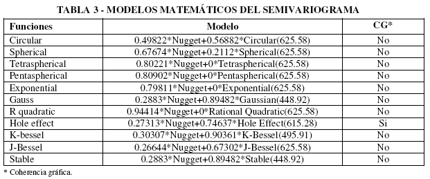 Los modelos matemáticos del semivariograma mostraron comportamiento diferente en los valores del Nugget, sin embargo, los coeficientes de los modelos del semivariograma son similares en el modelo circular, Spherical, Tetraspherical, Pentaspherical, R quadratic, Gauss J-bessel y Stable, y diferentes en los modelos Hole effect y K-bessel como se ve en la Tabla 3. El resultado de coherencia gráfica muestra que el modelo Hole effect tiene el menor error en el mapa de predicción con respecto a los demás modelos de semivariograma y muestra una superficie blanca alrededor de los puntos con datos que es apreciada en el mapa de error estándar como se ve en la Figura 7b.