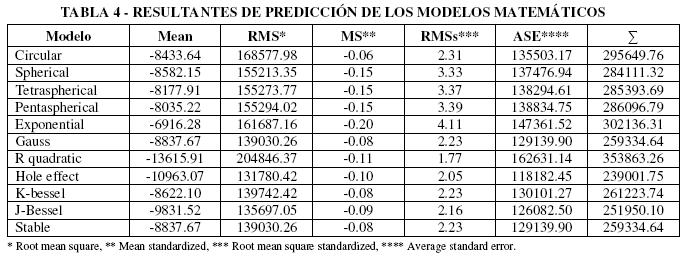 Los parámetros de búsqueda de vecindad fueron de tipo estándar con un máximo de búsqueda de 5 neighbors y un mínimo de 2 neighbors sectorizado en 4 sectores con un rumbo a 45° y offset a los 4 lados. Las pruebas estadísticas muestran los errores de predicción el cual es un indicador para elegir un modelo de mapeo con mayor exactitud y mejor grado de confianza como se muestra en la Tabla 4.