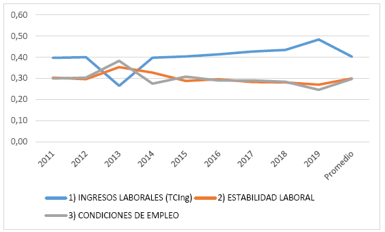 En cuanto a la evolución del comportamiento de cada dimensión se puede mencionar que el aporte de la dimensión de Ingresos en cada año fluctúa entre el 26 y 48%, bajando excepcionalmente a 26% el año 2013, debido a que el 24% de la población ocupada ganaba igual o menos de 2 S.M.N. y subiendo sucesivamente a partir del año 2016 con 41% hasta llegar a 48% el año 2019, año en que el 66% de la población ocupada ganaba igual o menos de 2 S.M. N.