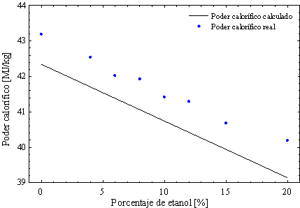 Como observado en la Figura 1, la ecuación (1) subestima en aproximadamente 2% el valor real del poder calorífico para porcentajes de etanol del 0 al 20%. Esto ocurre debido principalmente a que las propiedades se ven afectadas por la interacción entre los componentes del motor y el mismo combustible (inmersión).