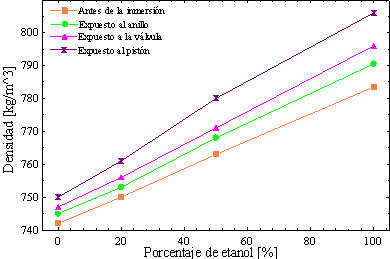 Con los datos anteriores se aprecia el efecto de la corrosión en la pérdida de masa, sin embargo, este no es el único resultado. Otro efecto que se encuentra es el cambio en las propiedades del combustible. El principal, es el cambio en la densidad antes y después de la inmersión. En la Figura 11 se observa el cambio en la densidad del combustible de prueba debido a la exposición de muestras de metal después de 4320 horas de inmersión a temperatura ambiente. Se observa que todos los combustibles de prueba inmersos en partes metálicas han aumentado en densidad respecto a su estado anterior (sin inmersión). Cabe añadir que la tasa de cambio de densidad de E100 es mayor que los combustibles con menor cantidad de etanol [5].