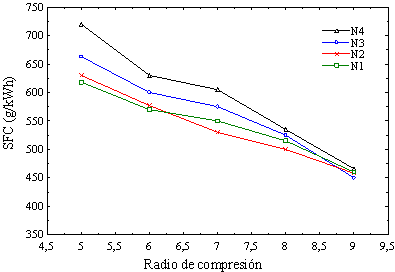 Folayan et al. [15] demuestran cómo la relación de presión afecta ciertas propiedades del motor de forma experimental. Por un lado, se demuestra que la variación de potencia de frenado a diferentes relaciones de presión y velocidad tiene un comportamiento casi lineal para rangos de velocidades de 1300 a 1600 rpm. Al mismo tiempo, esta relación de presión afecta en el consumo específico de combustible, tal como se aprecia en la Figura 3, que describe la relación entre radio de compresión y Specific Fuel Consumption (SFC).
