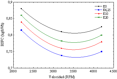 Como se puede observar en la Figura 4, el BSFC de la muestra disminuye conforme se incrementa la velocidad del motor. Como ya se explicó en la primera parte de este apartado el BSFC es un parámetro valioso para la determinación de la eficiencia del funcionamiento de un motor, un valor más bajo del mismo es equivalente a mejores resultados y como se puede ver en las gráficas obtenidas, el BSFC se incrementa con el incremento del porcentaje de etanol del combustible. Además, también vale mencionar que el motor presenta un mayor BFSC para gasolina pura y que los mejores resultados obtenidos son los de la muestra E6.25, resultado que puede ser explicado probablemente porque esta mezcla tiene un mayor poder calorífico (ver Tabla 2). Otra observación importante a estos resultados es que el valor más bajo de BSFC para todas las muestras se encuentra alrededor de 3200 rpm, sin embargo, una vez superada esta velocidad vemos que el BSFC incrementa, esto se da debido a la disminución de la eficiencia térmica del freno.