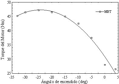 Considerando esto, podemos tener varios beneficios al operar un motor dentro de MBT, de forma más evidente se logra maximizar la producción de par en el motor, lo cual maximiza su eficiencia y a la vez mantiene al mínimo el consumo de combustible. Sin embargo, existen limitantes para alcanzar este nivel óptimo en la práctica, como por ejemplo para motores que trabajan con altas cargas se debe retardar el ángulo de encendido para poder evitar la destrucción del motor por golpe [18]. Sin embargo, el análisis en estas condiciones puede tener beneficios gracias a que se tienen parámetros de control más acertados debido a que se está haciendo el análisis en condiciones óptimas. Por lo general, la sincronización del ángulo de encendido para tener el MBT se determina mediante un barrido de chispa cuando se está haciendo la medición del par de frenado en el motor como se puede ver en la Figura 5.