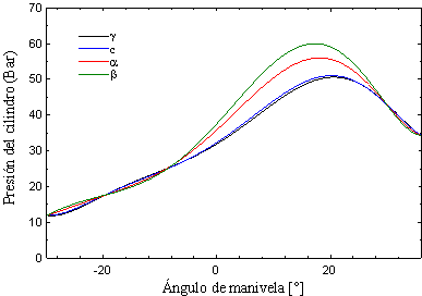 Teniendo en consideración que las muestras de combustibles α y β tienen valores similares en RON, podemos observar en la Figura 6 que tiene valores más elevados en su curva de presión, a diferencia de la muestra (que tiene un valor de RON 98,5 (ver Tabla 4), el cual es bastante cercano al de la gasolina regular, presenta menores picos de presiones y por lo tanto tiene mejores condiciones para alcanzar el estado de MBT en el motor en el que trabaje.