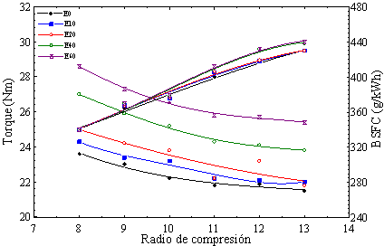 Gracias a una mayor capacidad de compresión en las mezclas gasolina-etanol, el torque, aumentó respecto a la gasolina. Además, el BSFC bajó y se tuvo mayor ventaja al momento de alcanzar el MBT.