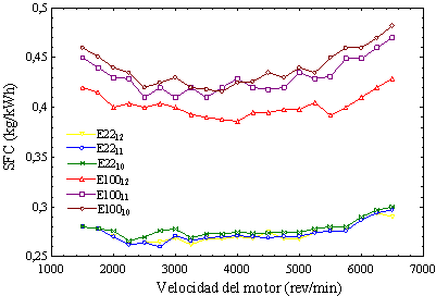 De forma más específica, dentro de los resultados hallados en la investigación podemos ver que en el caso de etanol hidratado es necesaria una mayor cantidad para poder alcanzar la unidad de potencia producida, esto entendido en relación a que el consumo específico de combustible expresa el caudal de combustible que requiere el motor por unidad de potencia producida. Entendiendo esto es que se explica que el valor del SFC del etanol hidratado sea mayor que el del E22 [9]. Como se puede ver en la Figura 8 el consumo específico de combustible se va reduciendo a medida que la relación de compresión se reduce, observando que la relación de compresión 10:1 tiene el SFC más elevado para gran parte del rango de velocidad analizado en la gráfica. Por esto se logra determinar que para poder reducir el valor del SFC en un motor que trabaja con etanol se debería aumentar la relación de compresión del mismo, al estar trabajando con combustibles que utilizan tanto gasolina como etanol en su composición esta opción es poco viable.