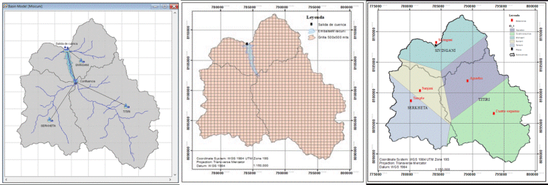 La plataforma IT-Inundación mediante modelo hidrológico HEC-HMS versión 4 determina para cada tormenta de amenaza calculada en IT-Lluvia el hidrograma correspondiente a la salida de la cuenca y procesa este hidrograma mediante un modelo hidrodinámico HEC-RAS, calculando la curva de remanso y analizando eventuales riesgos de inundación. El modelo HEC-HMS considera las 3 subcuencas principales Figura 5 . Los parámetros hidrológicos son exactamente los mismos en tanto a las metodologías de pérdidas por infiltración en el suelo y transformación de lluvia a caudal tomadas en cuenta en la metodología convencional descritas en la sección 2.4 y la precipitación es representada en grilla de resolución de 500x500 metros Figura 5.
