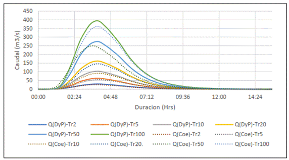 Por medio de las dos metodologías convencionales, se obtuvieron los hidrogramas para los periodos de retorno de 2, 5, 10, 20, 50 y 100 años (Figura 6). El hidrograma resultante de la metodología por coeficientes de desagregación (Coe) presenta caudales inferiores al hidrograma resultante por el criterio de Dick y Peschke (D y P), en la Tabla 6 se presentan los caudales máximos por periodo de retorno. La diferencia entre las dos metodologías convencionales es de 8 a 13%.