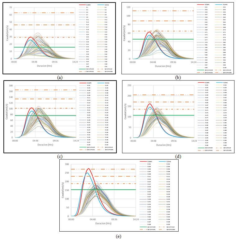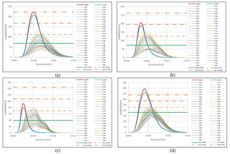 Para 20 y 50 años de periodo de retorno, los hidrogramas tienen las mismas características ya mencionadas para un periodo de retorno de 100 años. Para pequeños periodos de retorno 2, 5 y 10 años los máximos caudales de los hidrogramas determinísticos se encuentran en la franja de caudales estocásticas Qmax T excedido con 50 % y Qmax T excedido con 10 %. Existiendo una mejor correspondencia entre los máximos caudales de los hidrogramas convencionales y estocásticos.