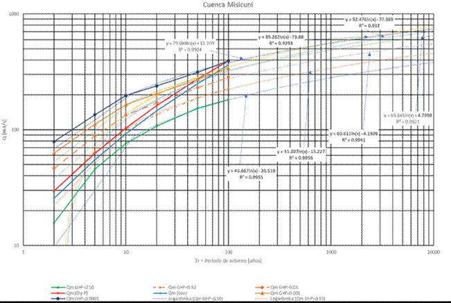 Las relaciones Qmax(Tr) pueden dibujarse en ejes con escala logarítmica permitiendo que los caudales estocásticas y convencionales puedan extrapolarse para estimar los caudales con periodos de retorno para 1000 y 10000 años, Figura 9 y Tabla 10.