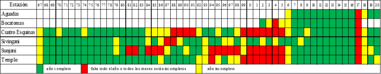 Los porcentajes de relleno de datos de la mayoría de las estaciones son catalogados entre altos (Templo 28 %, Cuatro Esquinas 34 % y Sunjani 38%) a muy altos (Aguadas 75% y Bocatoma 78%), siendo Sivingani 11 % la única estación de registro normal. Bajo este análisis y debido a su retiro desde enero del 2017, por su ubicación dentro del embalse y por el inicio de operaciones del PMM la estación Bocatoma fue descartada, El porcentaje de relleno de datos promedio sobre las 5 estaciones restantes (Sivingani, Templo, Cuatro Esquinas, Sunjani y Aguadas) es de 40 %. Este indicador no es lo ideal, sin embargo, es lo mejor posible en el momento.