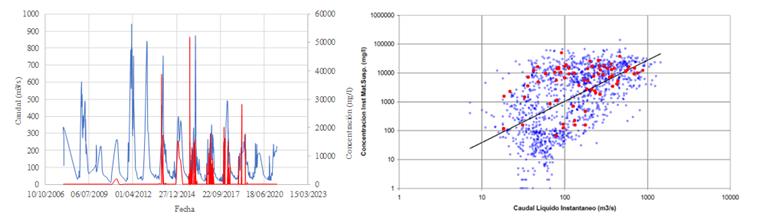 Figura 2: Concentraciones de sedimentos en suspensión para la Estación Villamontes período 2011-2021 (línea azul: caudal líquido; línea roja concentración sedimentos) y la relación caudal líquido vs. Concentración de sedimentos.