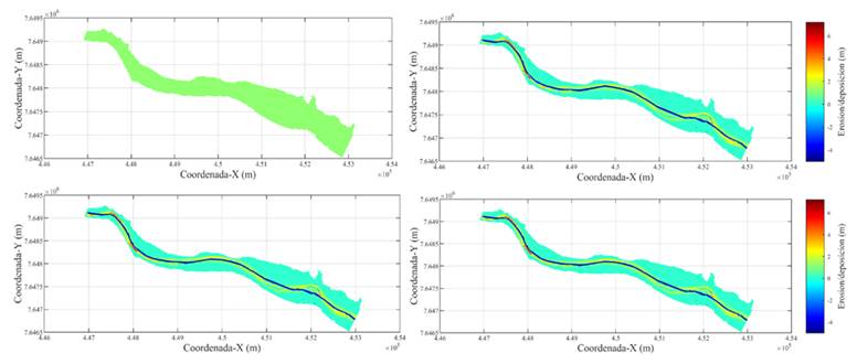 Los resultados de la modelación morfológica a corto plazo, muestran de manera ilustrativa la dinámica morfológica de la zona de estudio durante la ocurrencia de un evento extremo. El río Pilcomayo, en el tramo de la zona de estudio, se cataloga como un río del tipo “braceado”, donde el curso principal cambia continuamente de dirección, además de presentar divisiones y uniones en su curso, y todo en un lapso de tiempo corto, i.e. días. La Figura 4 presenta la evolución de la erosión y sedimentación. El proceso morfológico es continuo, con deposiciones a lo largo del canal principal de hasta 20 metros, y erosión de hasta 10 metros. Este comportamiento que ocurre durante una crecida, fue ya observado y comentado por [13], observándose una erosión de hasta 7 metros en Estación Villamontes.