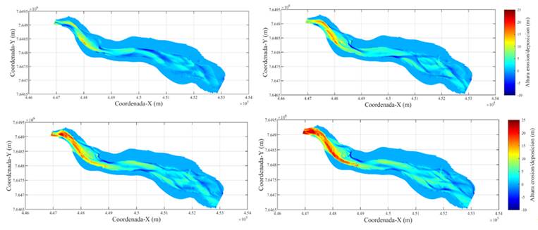 Figura 3: Resultados para la erosión y sedimentación calculadas en la modelación morfológica de “largo plazo”.