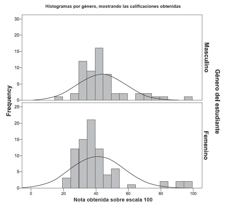 La comparación de las calificaciones por género, revela un ligero mejor rendimiento por el género, femenino frente al masculino como se aprecia en histograma con curva normal para cada grupo (valores extremos).